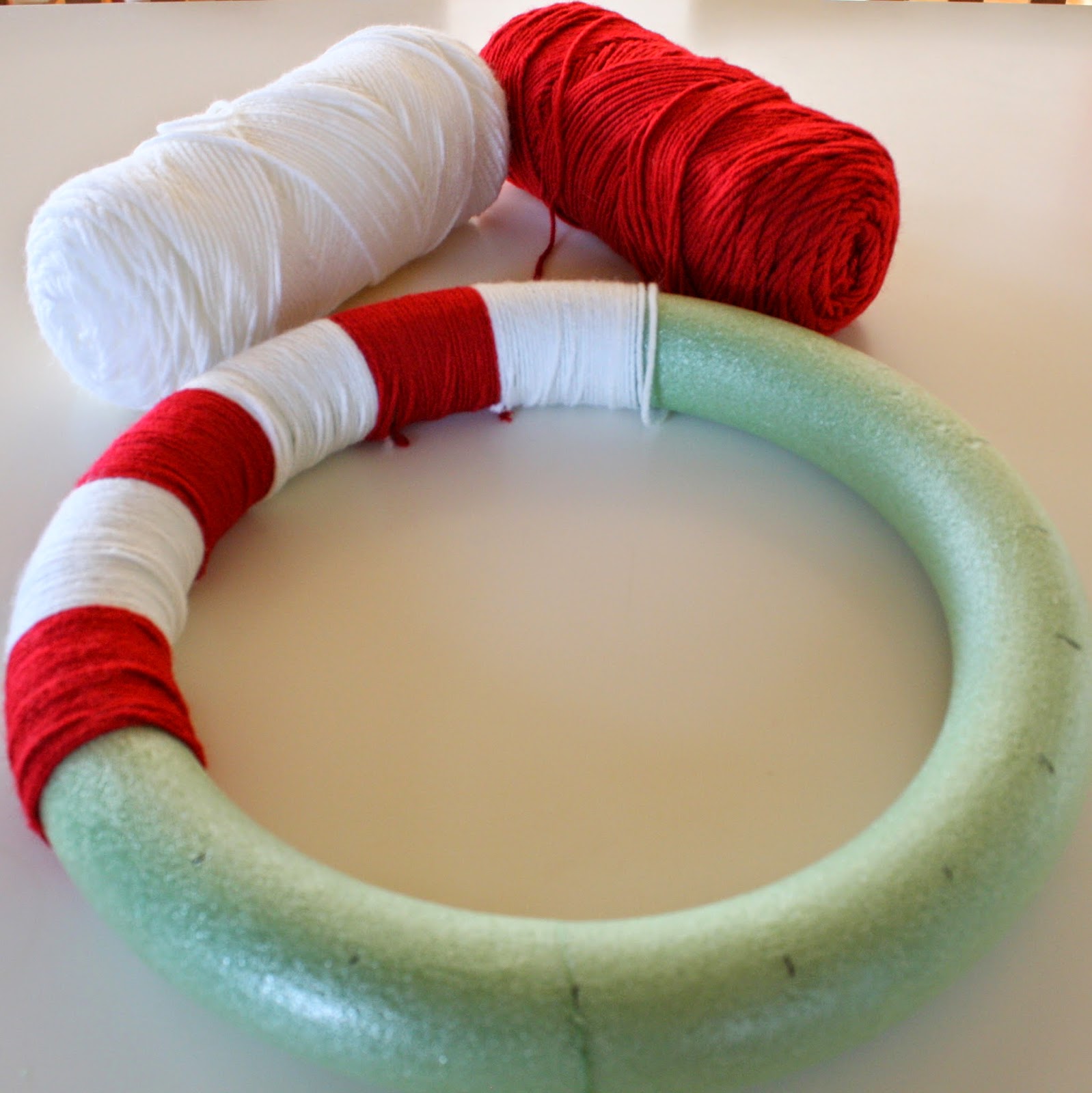 Start by measuring and marking off 2″ – 3″ sections across the wreath form. Tie one end of the red yarn to the wreath form and start wrapping. When you get to the next section you’ve marked off, cut the red string in the back of the wreath, and tie it to the white string. Wrap the white string around to the next section and keep alternating until the wreath is covered.