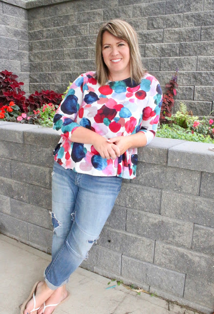 I love Deena’s watercolor print top and distressed jeans. Be sure to visit her blog, Shoes to Shiraz, to see more of this look!