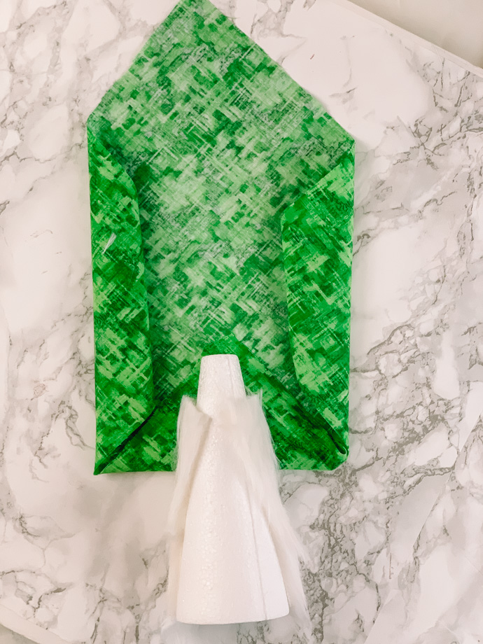 To make the hat, lay your cone on the fabric lengthwise and then fold each side of fabric towards the middle. Fold again until both sides are overlapping each other.