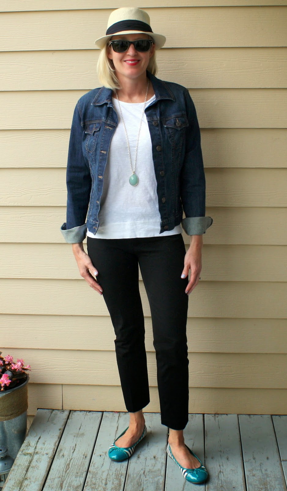 White top, black pants, jean jacket, turquoise necklace, sunnies, fedora, floral heels