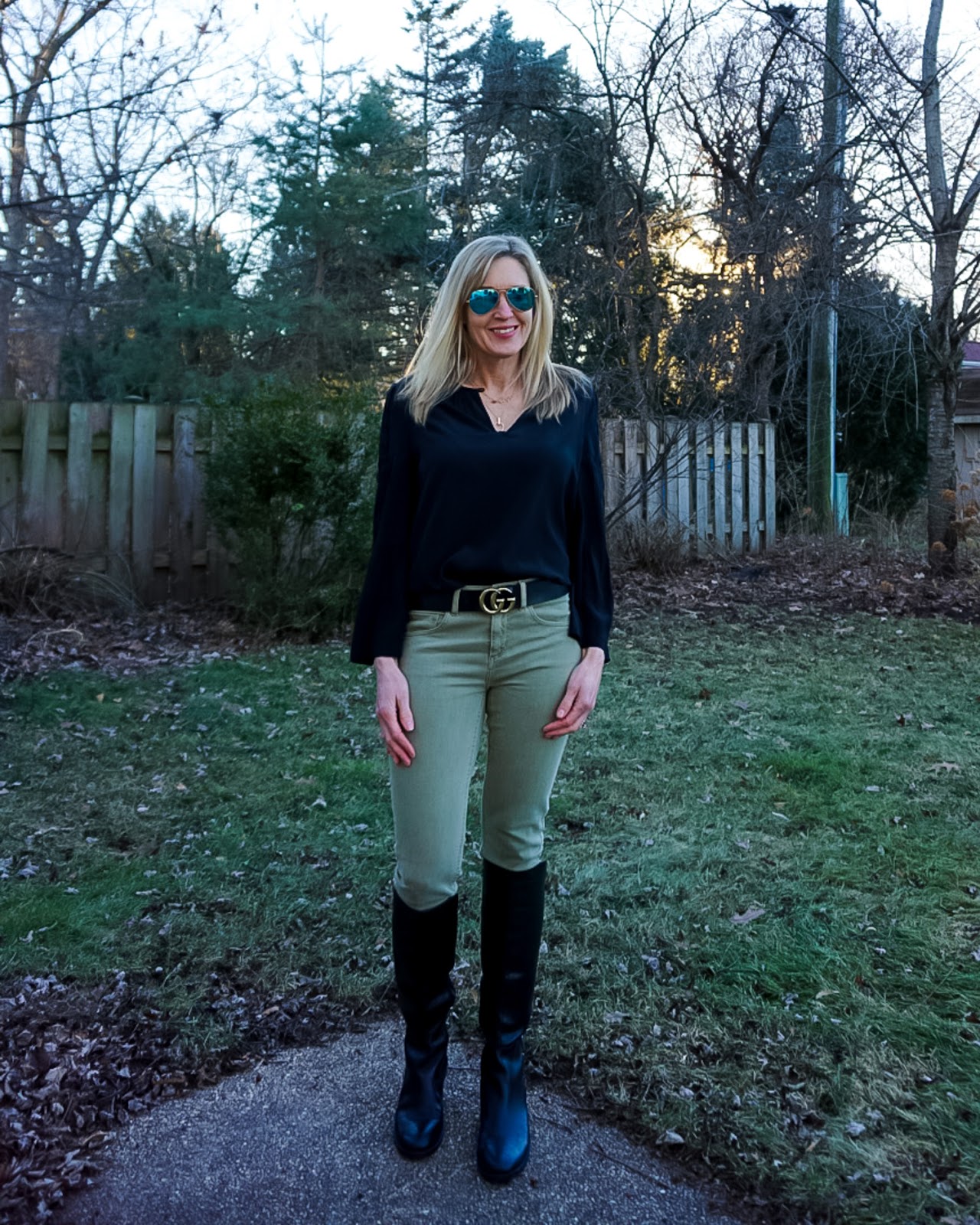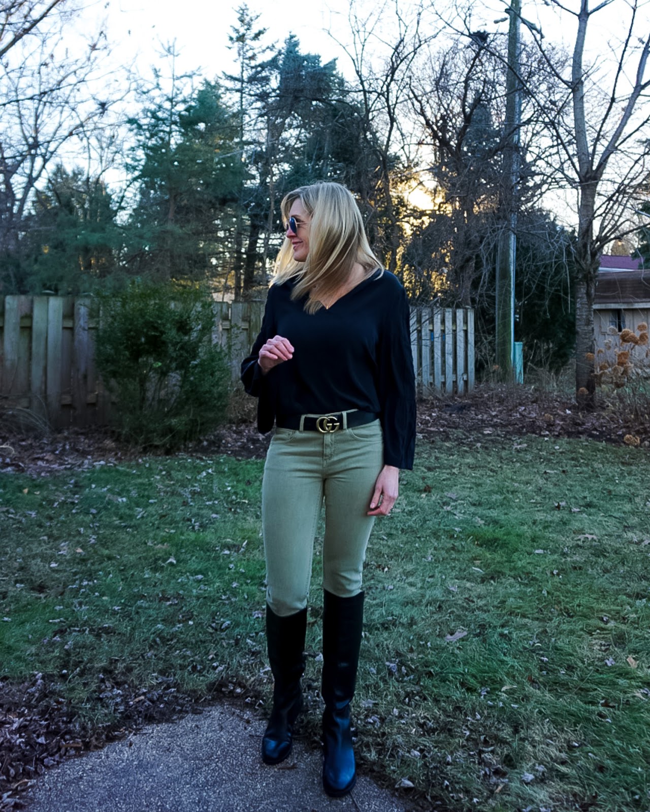 Look #1: Olive denim + black blouse, black belt, tall black boots. I always have loved how olive pops when paired with all black. I wore this first outfit for a couples night out of dinner and live music.