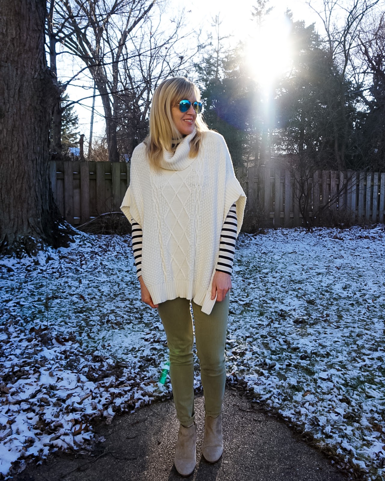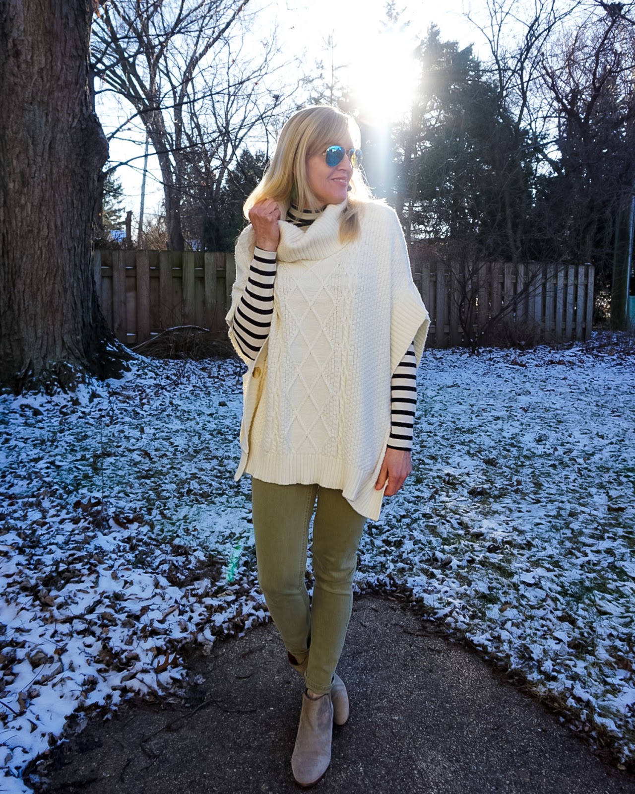 Look #2: Olive denim + striped turtleneck, ivory poncho, taupe booties. I wanted to stick to neutrals for this second look. Ponchos are an easy way to layer, stay cozy and still look stylish. This outfit was perfect for running errands on the weekend and meeting up with a friend for coffee.