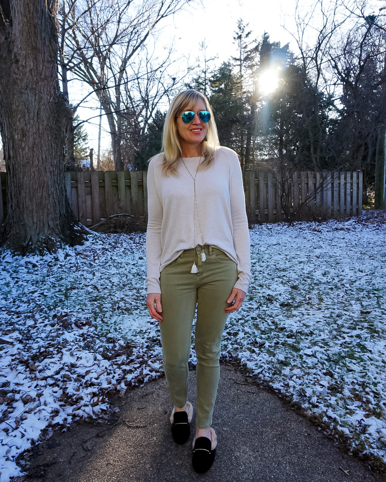 Look #3: Olive denim + grey sweater and mules. This is my every day, work from home uniform. These faux fur lined mules are perfect for throwing on when you have to run out!