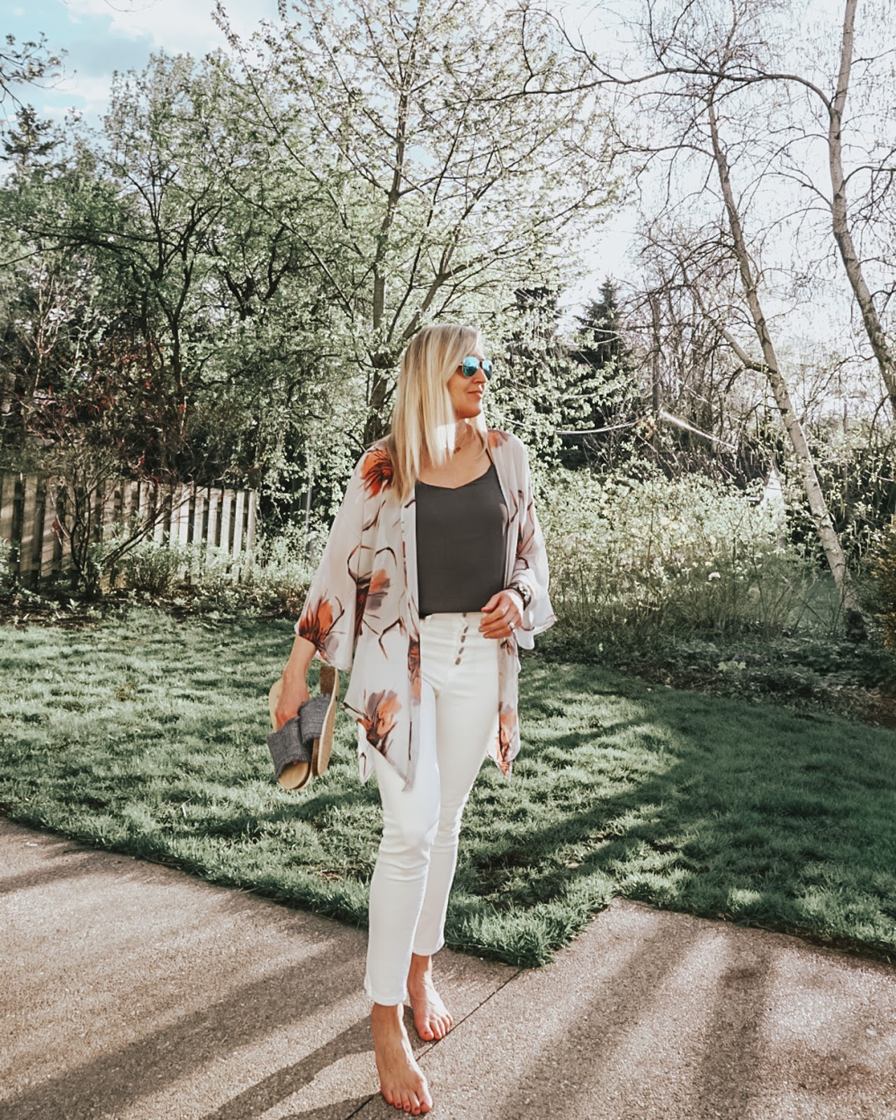 Chambray and white go hand in hand for summer, so I knew right away I’d be wearing these sandals with my white denim. I needed a light layer and added a kimono (if you don’t have a kimono yet, it’s the perfect spring and summer topper). These sandals would be cute with a chambray dress for a denim on denim look or with bright shorts and a tank or tee!