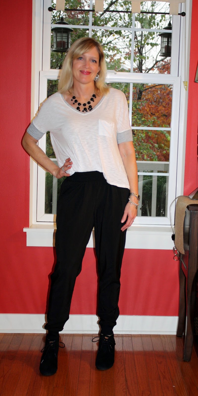 When you are wearing a tee with track pants, dress it up by adding a statement necklace. Doing a half tuck with this loose fitting tee took some of the bulkiness away. I added wedge booties to complete the look.