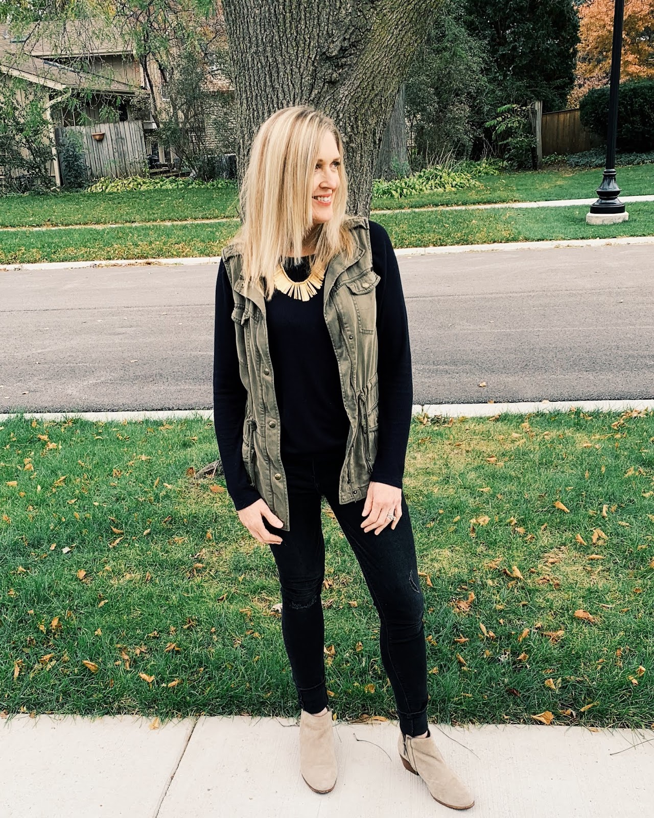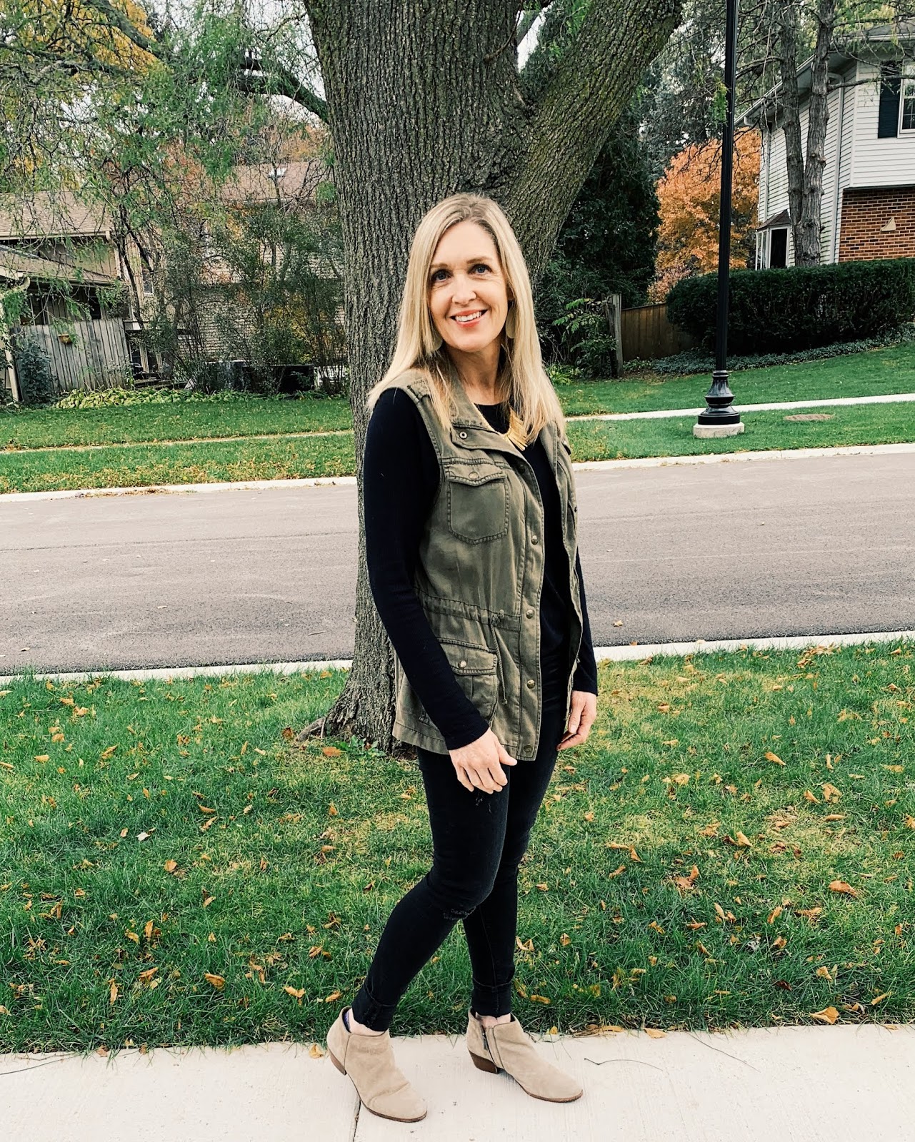 This utility vest has been one of my go-to’s for several years. It transitions effortlessly from season to season, plus, when you wear a vest, you instantly feel more put together. I love how styling olive with an all black outfit really makes it stand out! This is an easy look to throw on and go!