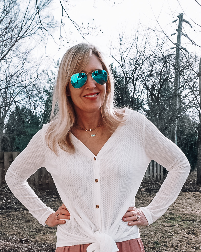 Another waffle top. This one comes in 10 different colors, including two options with printed sleeves. It also runs true to size, and I’m wearing a small. See how I styled it here.