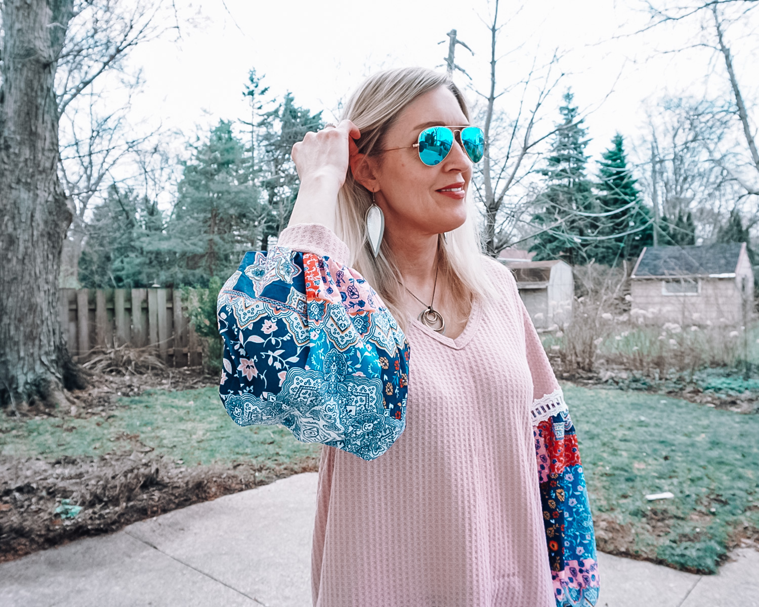 I love waffle knits, and this one is so good with the boho printed sleeves. It comes in 6 other colors and runs true to size. For reference, I’m wearing a small. You can see how I styled it here.