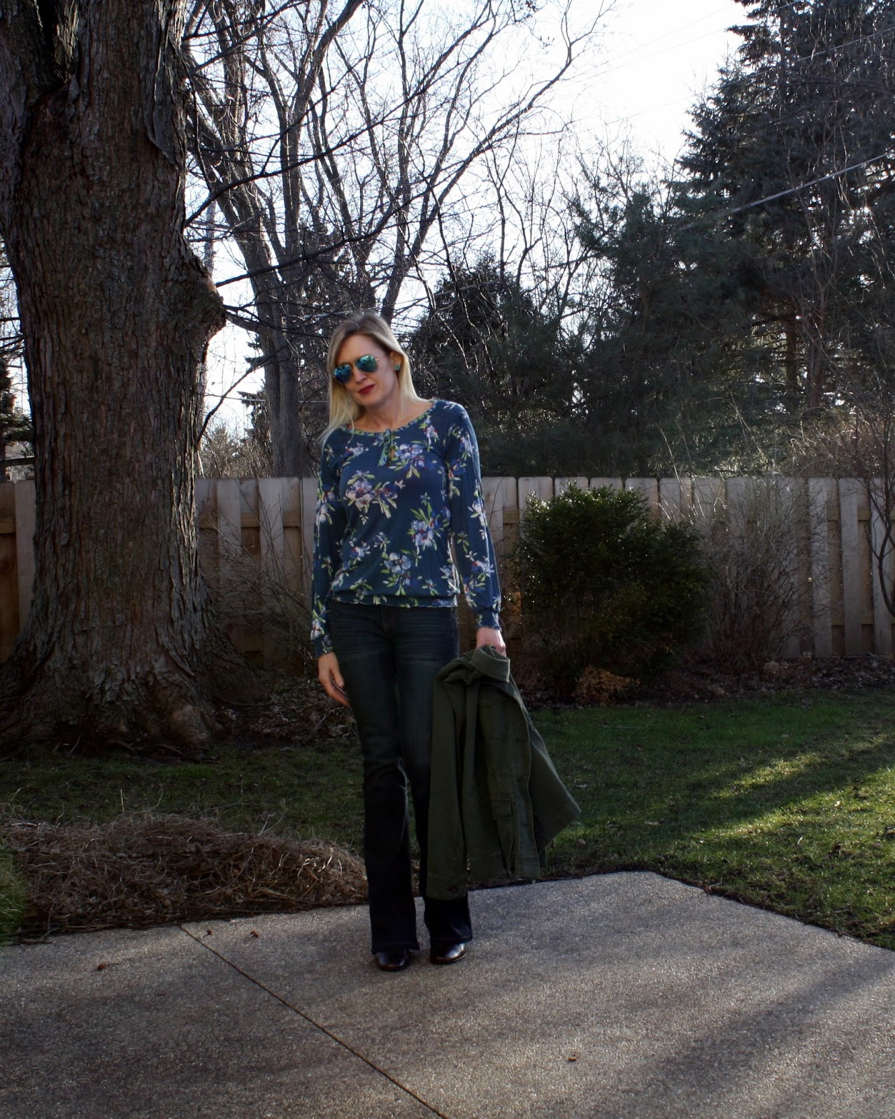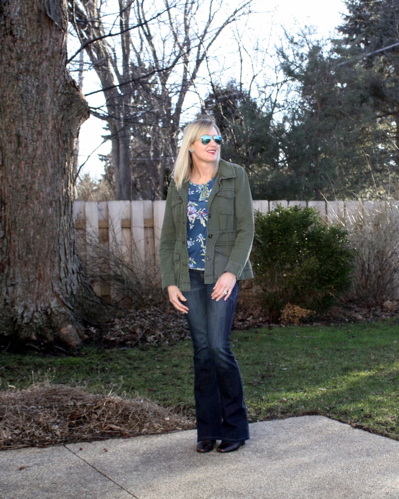Happy St Patrick’s Day! One of my favorite things about blogging is getting inspiration from my blogging friends. When Lisa from Daily Style Finds created this style board a few weeks ago, I thought it was a beautiful combo and wanted to recreate it for St Patrick’s Day! I already had the utility jacket and floral top hanging in my closet but never thought to pair them together. The army green is a refreshing change from the traditional St Paddy’s green and it gives a nice edge contrasted against the pretty floral print!