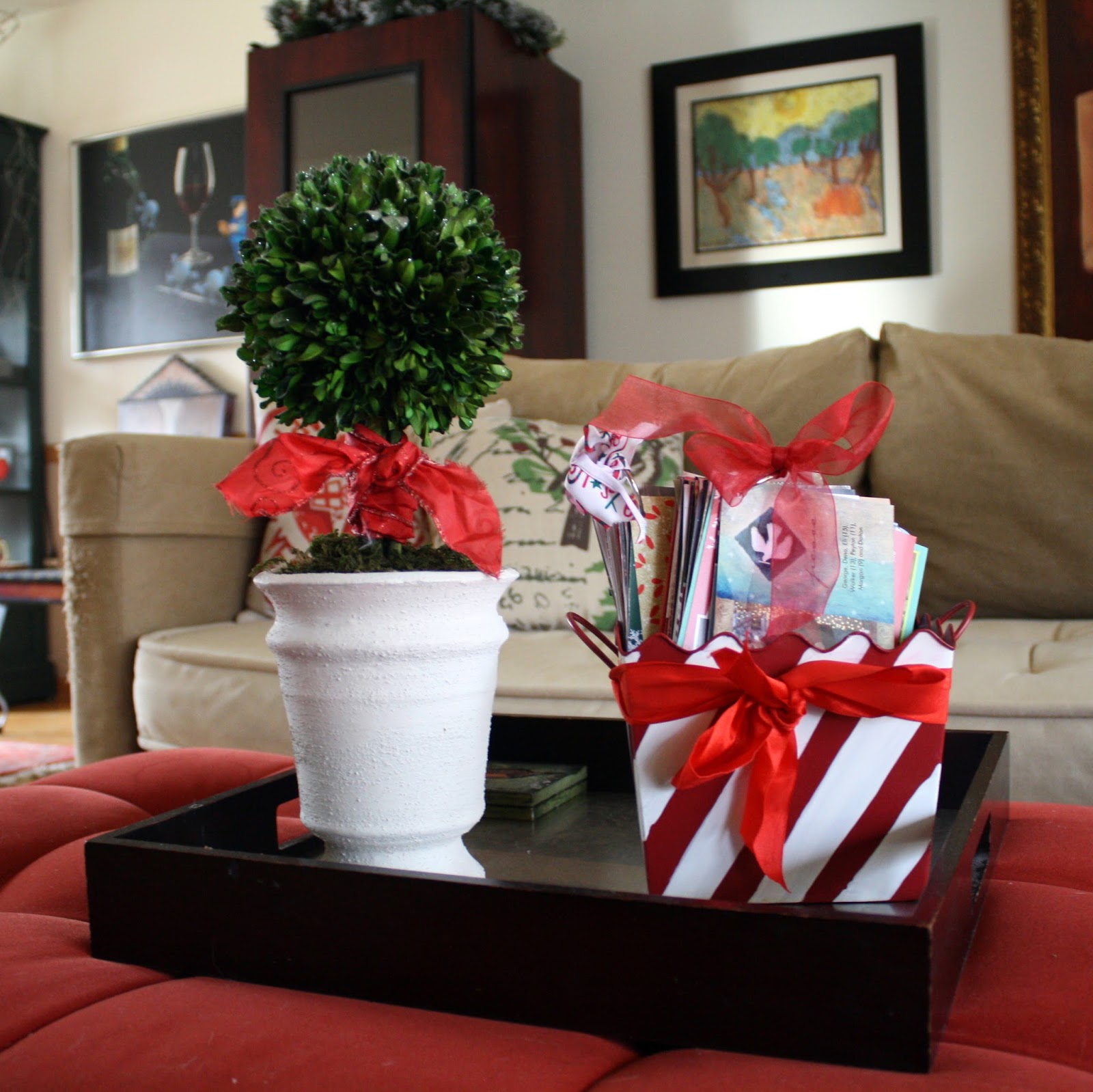 Here’s an easy way to display your holiday cards…create a flipbook. Punch a hole in the corner of each card, place them in a binder ring, add a ribbon. I keep a few of the past years out in this candy stripe bin. It’s fun to look back over the years!