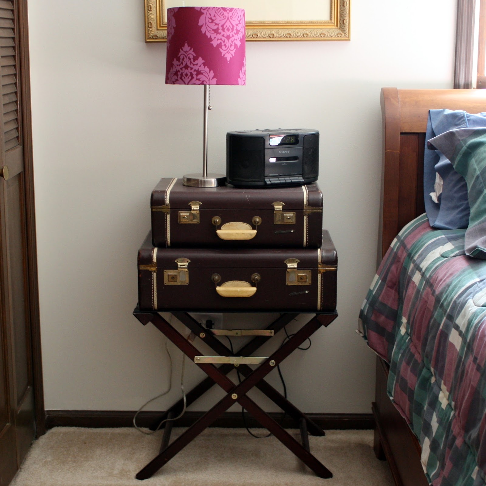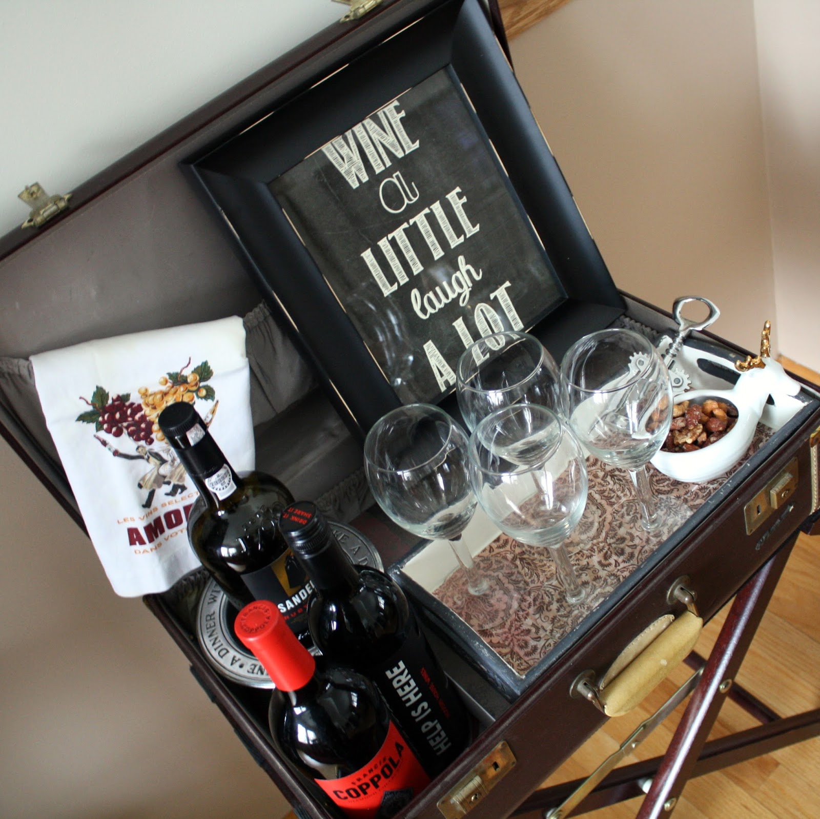 I’ve been obsessing about having a bar cart in my dining room ever since I saw Carrie’s back in November. It’s not in my budget to purchase one, so I decided to make my own. I got the idea to use vintage suitcases here. I had two that once belonged to my grandparents that I had re-purposed as a nightstand in the guest room. I used the larger suitcase to create a wine station.