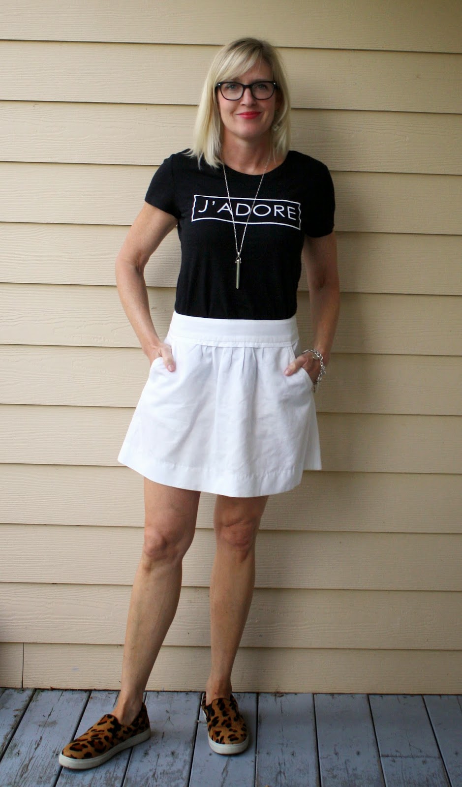 Tee: Old Navy / Skirt: J.Crew (similar) / Slip-on’s: Steve Madden / Necklace: Stella & Dot