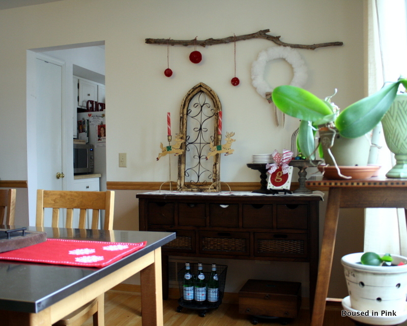 Our dining room is decked out with a small tree and plenty of lights. I saw the DIY for the fluffy white wreath on HGTV. Guess what it’s made of….dusters from the Dollar Tree!