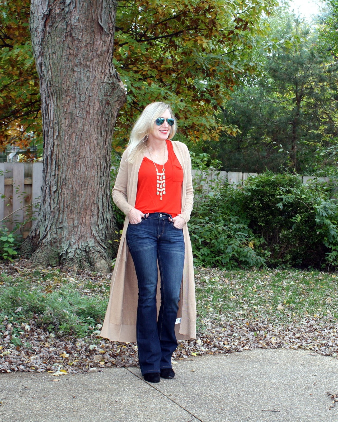 Do you feel like you need to stock up on holiday outfits this time of year? I’m always drawn to sequins, embellishments, and sparkle but then reality sets in. I remember that most of my parties are casual get-togethers with my besties. Today I wanted to share how to dress casually for the holidays with an easy outfit idea. This outfit formula is perfect for relaxed gatherings: red top + cardigan sweater + flare jeans + statement necklace + booties. Red and camel are an unexpected combination and I love that the colors balance each other out. This outfit is comfy, neutral, and adds the perfect pop of color! For more holiday style inspiration click HERE to see how I styled a casual NYE look!