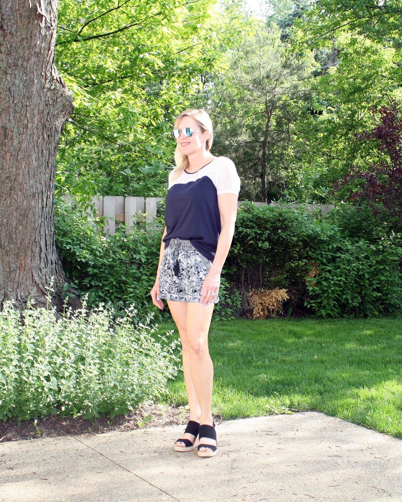 These muted grey leaf printed shorts are soft, fluid, and comfortable to wear. I love the pockets and tassel drawstring! Instead of styling the shorts with a solid top, I came across this pretty lace block tee. The feminine lace detail on the neckline and arms adds interest without competing with the shorts. I can see these being styled with a flowy button-down top, dressed up with a blazer or down with a graphic tee. My goal was to purchase a complete outfit. Mission accomplished!