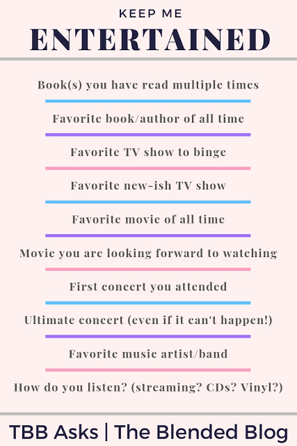 Happy Monday! Today I’m joining The Blended Blog fortheir Keep Me Entertained Edition of TBB Asks. The prompts are highlighted below, so if you’re a blogger, join us! If you’re not a blogger, I’d love it if you participated through the comments!