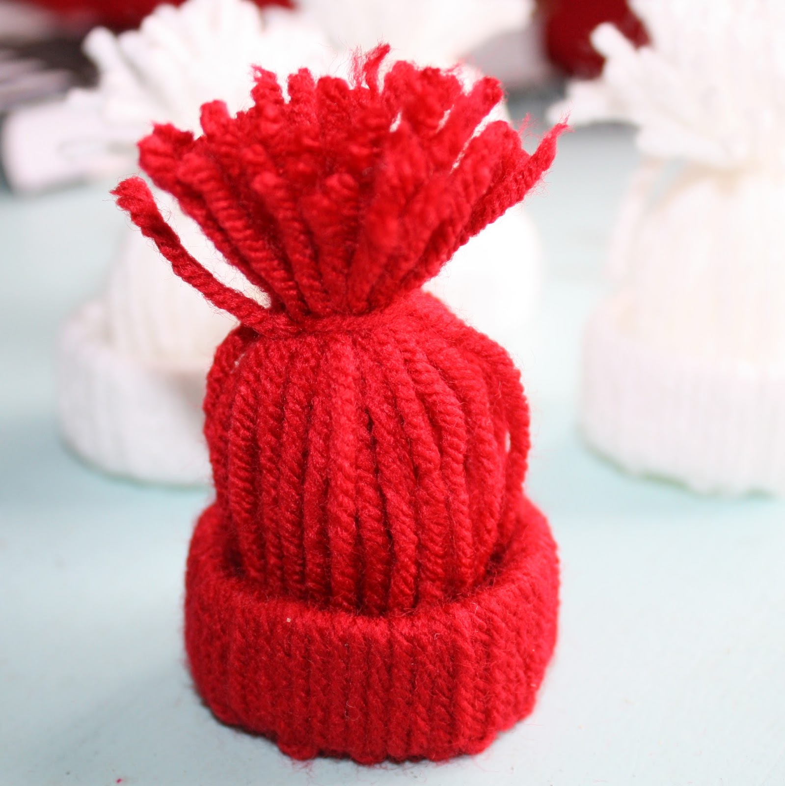 Did you have a good weekend? I took Friday and Monday off for the Thanksgiving holiday and it was so nice to have a little break! I did some black Friday shopping with my daughter and her friend and spent part of the weekend putting up holiday decorations and working on some DIY’s. While a few of my friends were knitting scarfs and hats, I had the idea to make these mini pom pom knit hat ornaments to hang from the branch I have in my breakfast nook. They were easy to make and the best part is no knitting required! I had leftover yarn from the holiday wreath I made last year and the only other supplies needed are scissors and an empty toilet paper or paper towel roll.