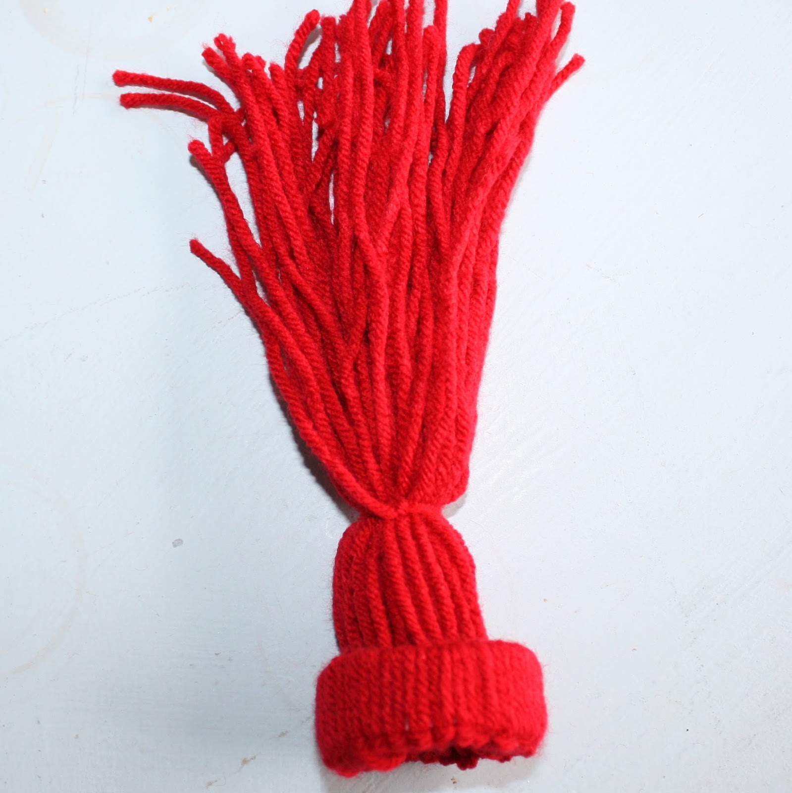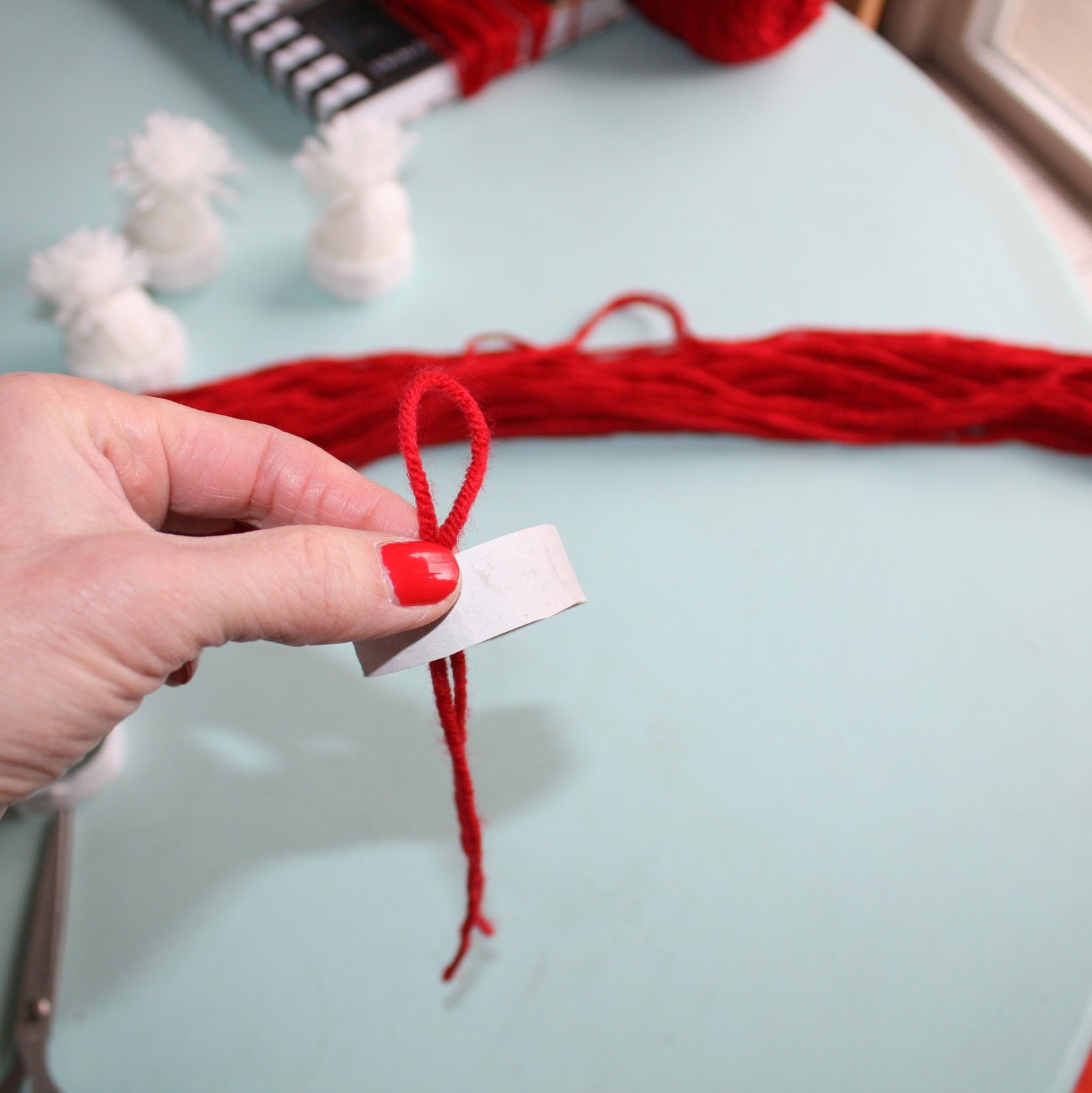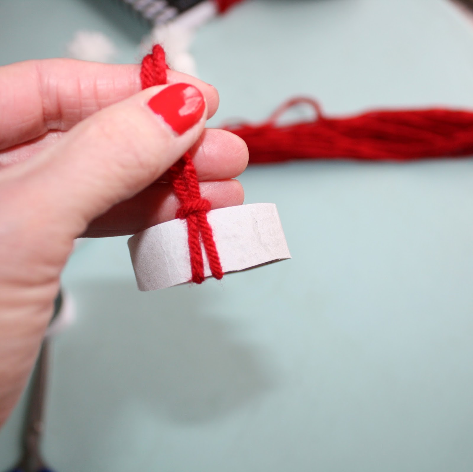 Take 1 strand of year and fold in half to form a loop. Insert through the cardboard roll with the loop up.