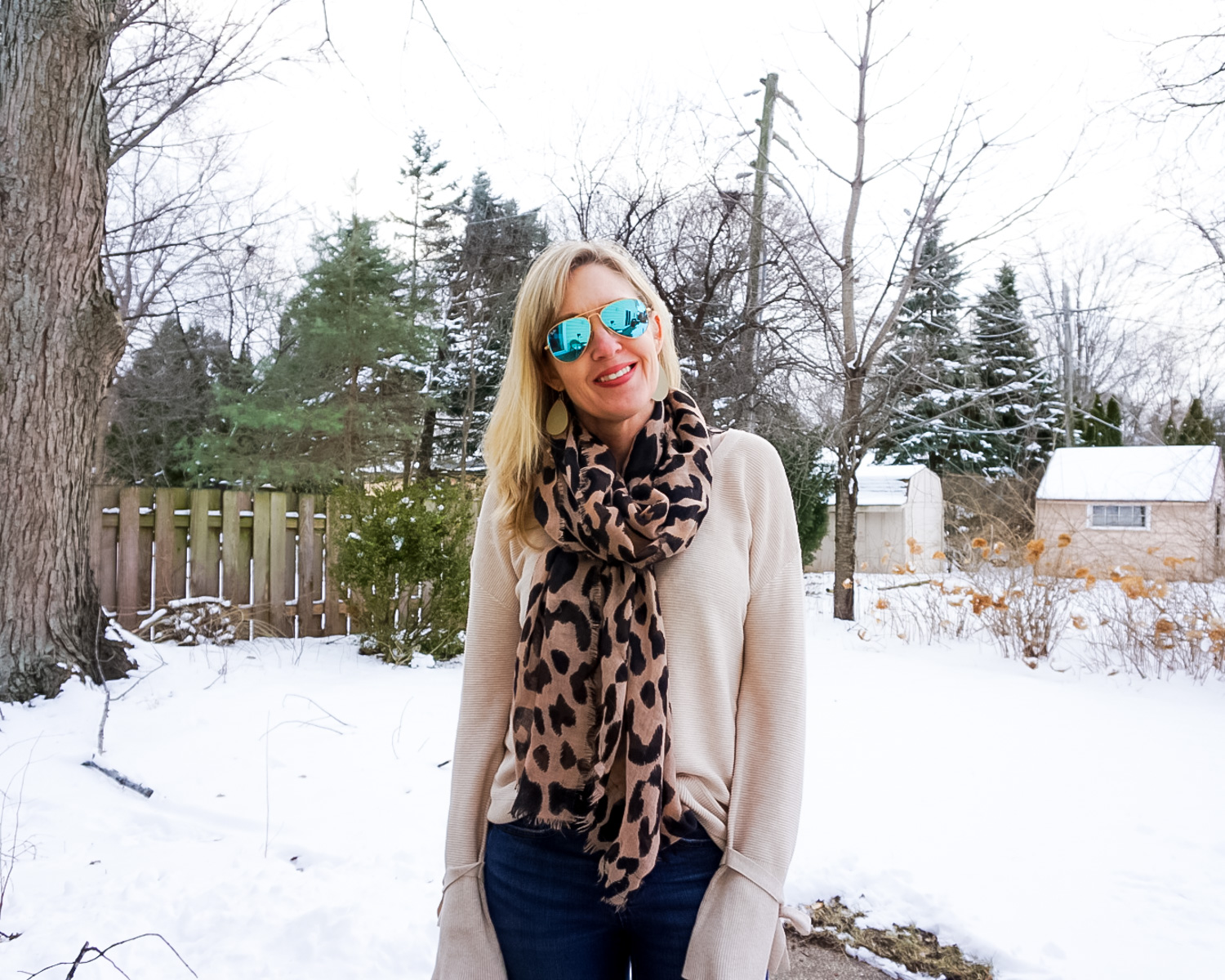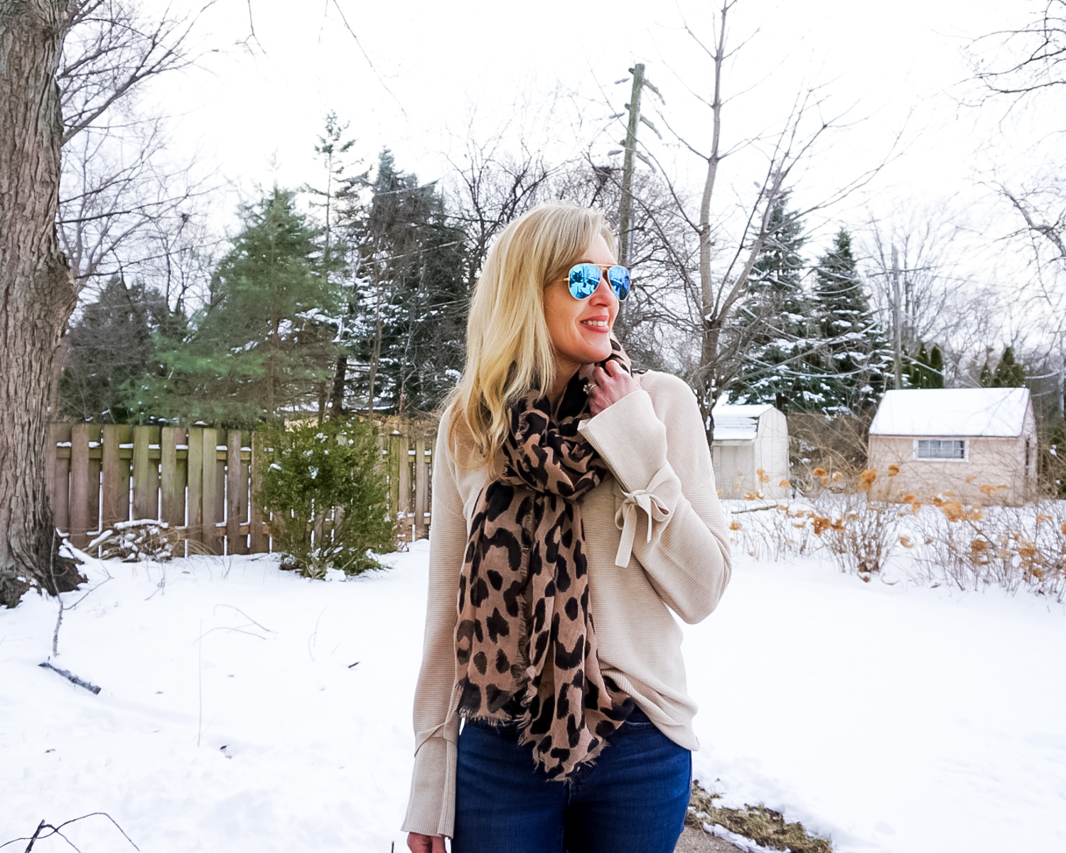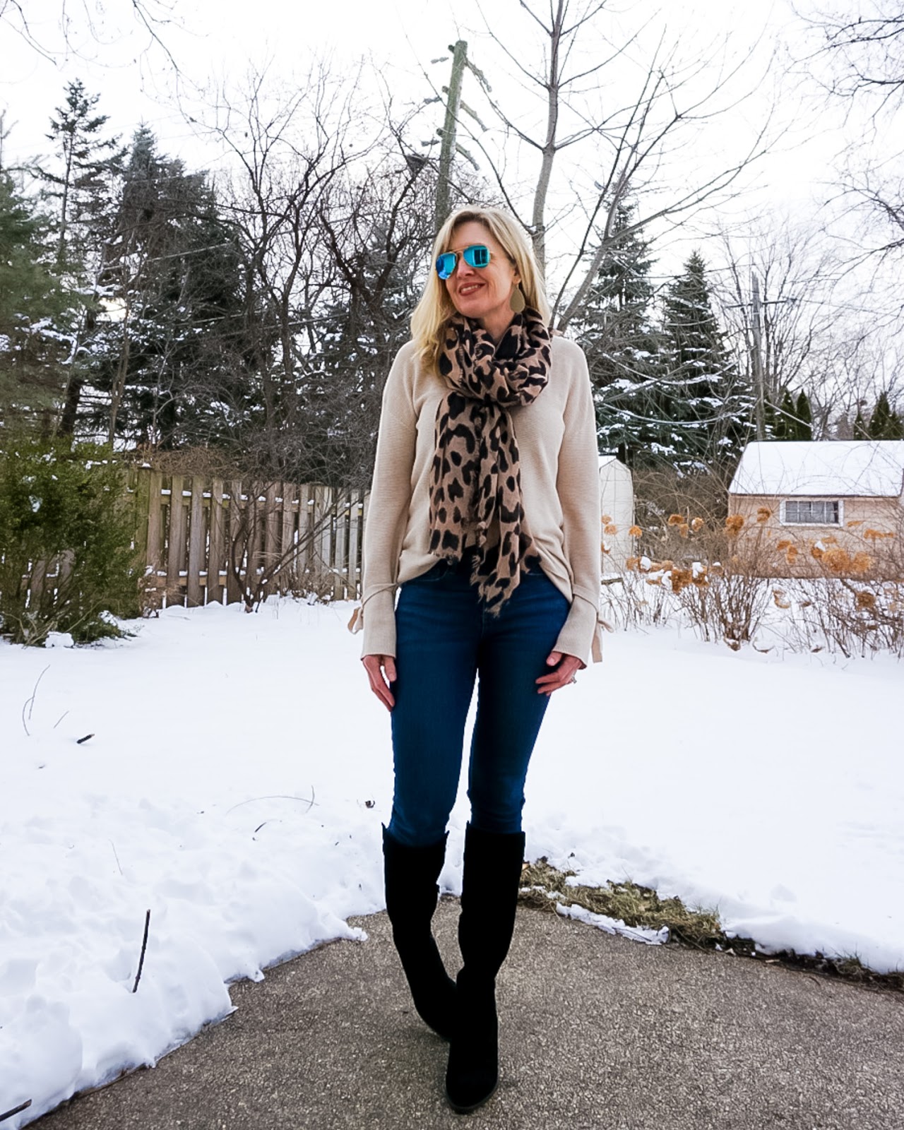 Happy Valentine’s Day Friends! Do you celebrate this Hallmark holiday? We don’t, but since my husband just got back from a business trip this afternoon and there’s no food in the house, we are going out for a bite to eat to catch up. Like I mentioned in this post, I like to keep my outfits on the casual side. Which brings me to today’s look…these boots were a Christmas gift that I haven’t worn often enough. I like to plan my outfits around my shoes and black and tan is such a classic color combo. I didn’t love the outfit with black denim, so I went with a regular dark wash and tied it all together with a fun leopard scarf! My sweater is from Gap last fall and sold out, but I linked up several options that also have tie sleeves.