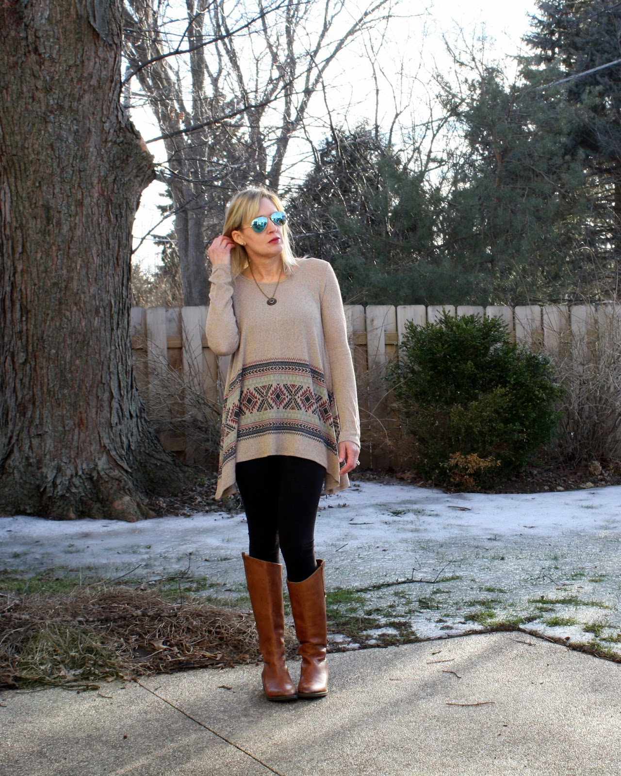 For running errands or lunch with friends, I paired this tunic with my favorite comfy leggings, tall boots and a simple initial necklace.