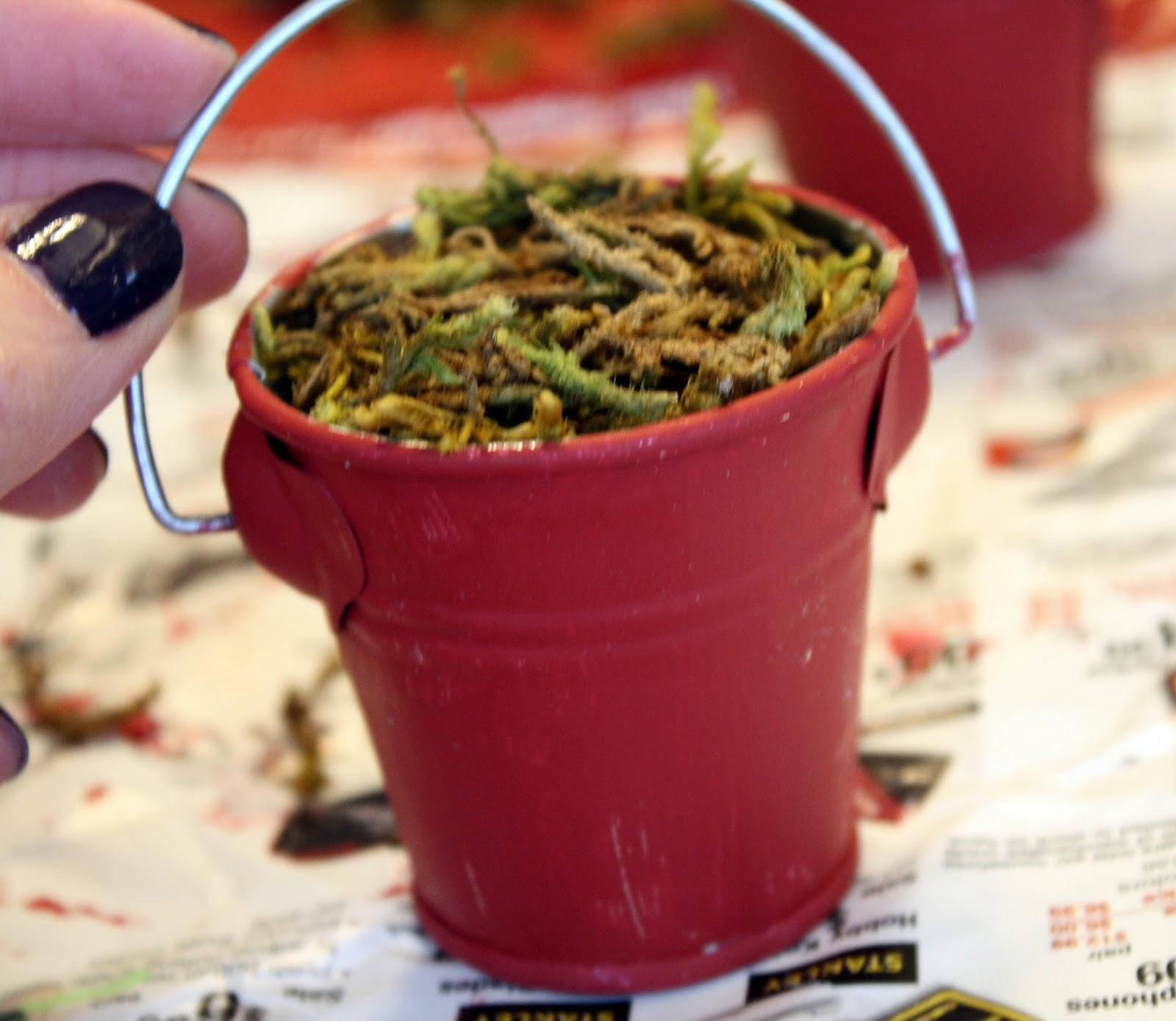 Paint the bucket with 2 – 3 coats of red paint. Let dry in between each coat.