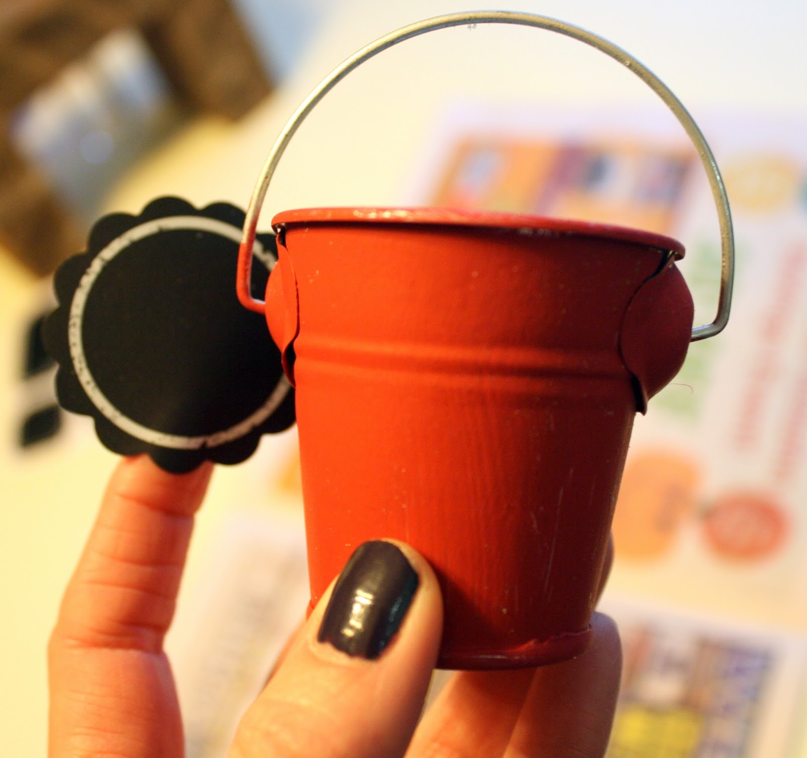Once the paint is dry, center and apply a chalkboard sticker onto the bucket.