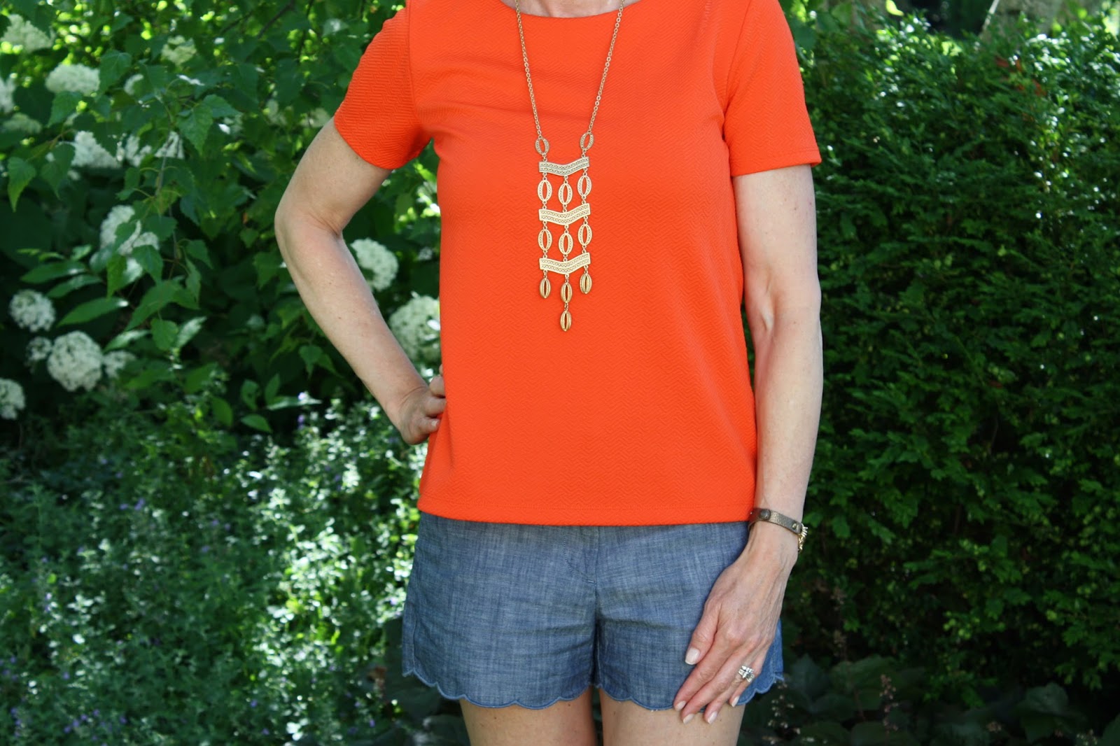 It seems like I always have some Gap rewards to use and when I saw these scalloped shorts on sale, I had to snatch them up! The scallop edge is a fun detail to these tailored shorts and I never get tired of chambray. These can be dressed up or down and today I went with a casual style. Orange and chambray is a winning combo so all I needed to complete the look was a necklace and my leopard sandals for a fun finishing touch!