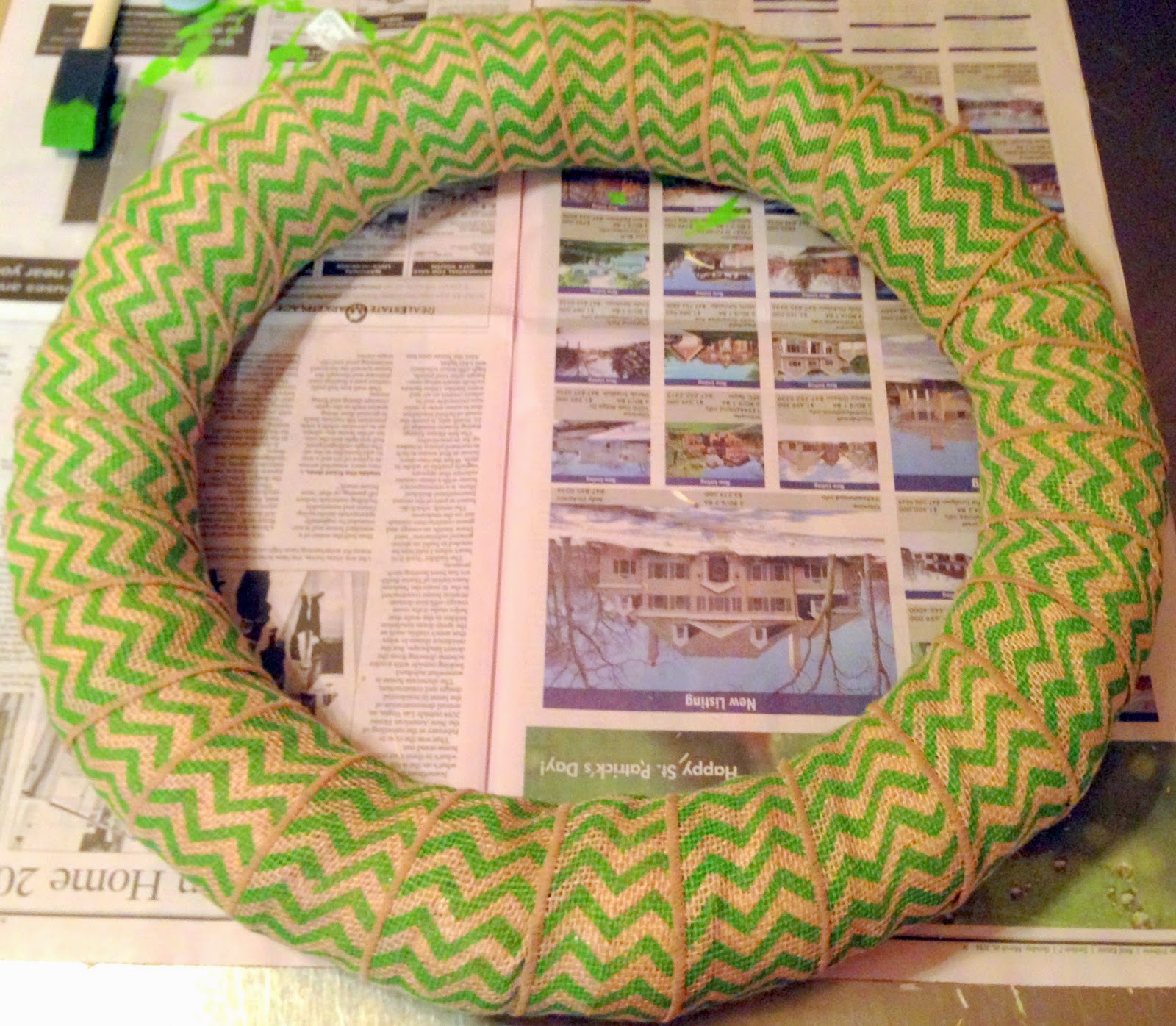 I used this cute green chevron burlap ribbon and wrapped it around the wreath form. Staple the ribbon to the back every few wraps to ensure it does not unravel.