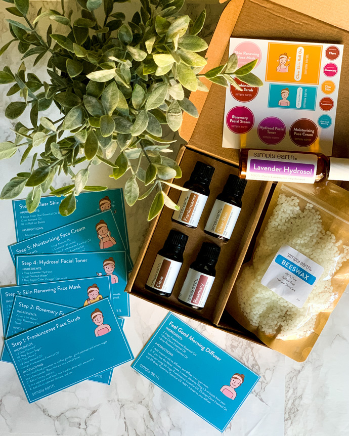 Are you like me and buy essential oils but don’t know what to do with them? I’ve been using essential oils for years, mainly in my diffuser. I’ve made a few recipes here and there like bug spray and eucalyptus vapor rub. Once in a while, a friend will host a girls night, and we’d make a few recipes, but that’s about it. So when Simply Earth reached out to me to find out if I was interested in joining their squad to review the August Essential Oils Recipe Box, I was all in!