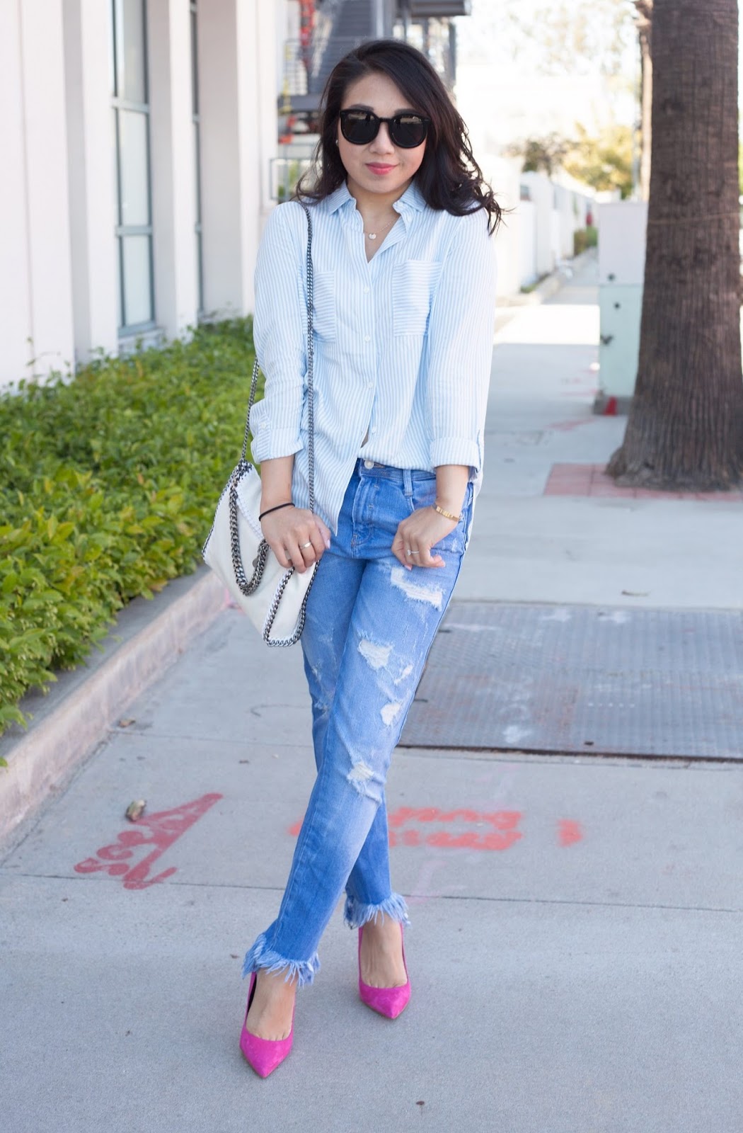 This week my pick is Sheree from Posh Classy Mom! Her frayed jeans are fabulous, and this relaxed chic look is styled to perfection with a pop of pink!