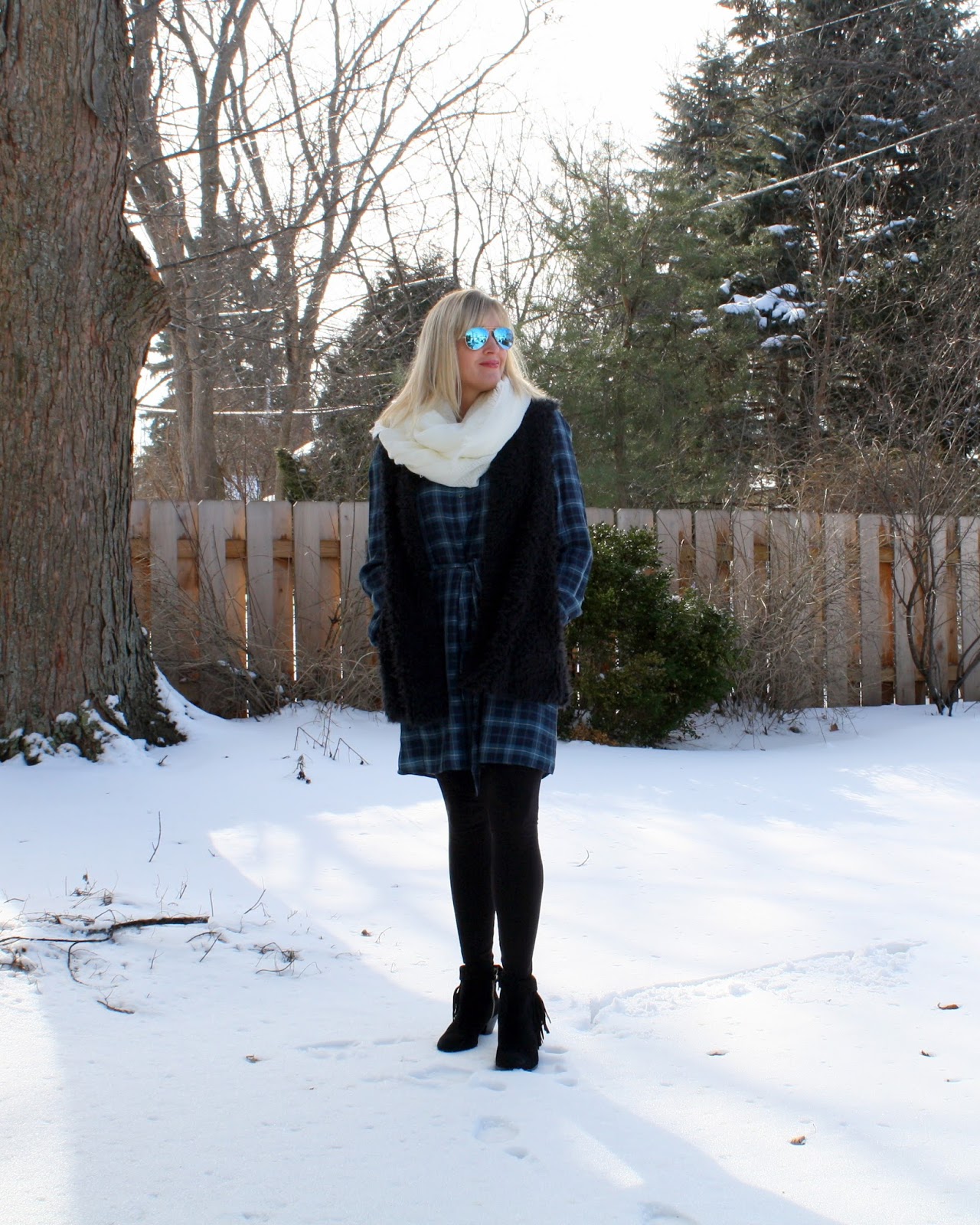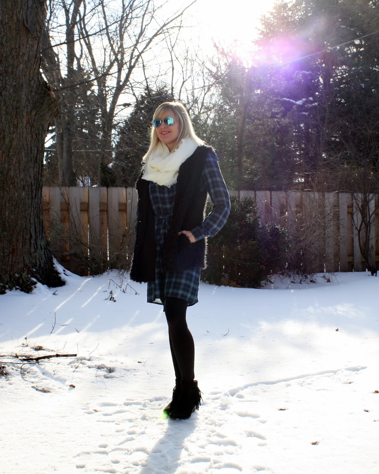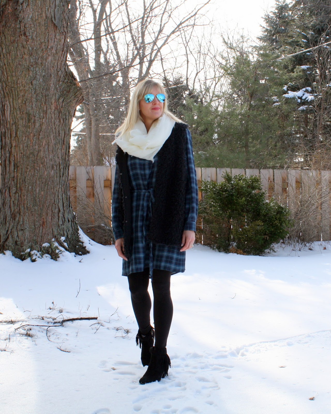 To create an effortless travel look it’s best to layer easy details like this plaid dress paired with leggings. You never want to be sitting in a meeting and spend the morning thinking you can’t wait to get to the hotel so you can change your clothes. Style an outfit that will take you through the day and onto dinner.