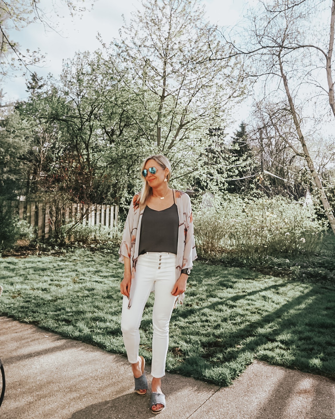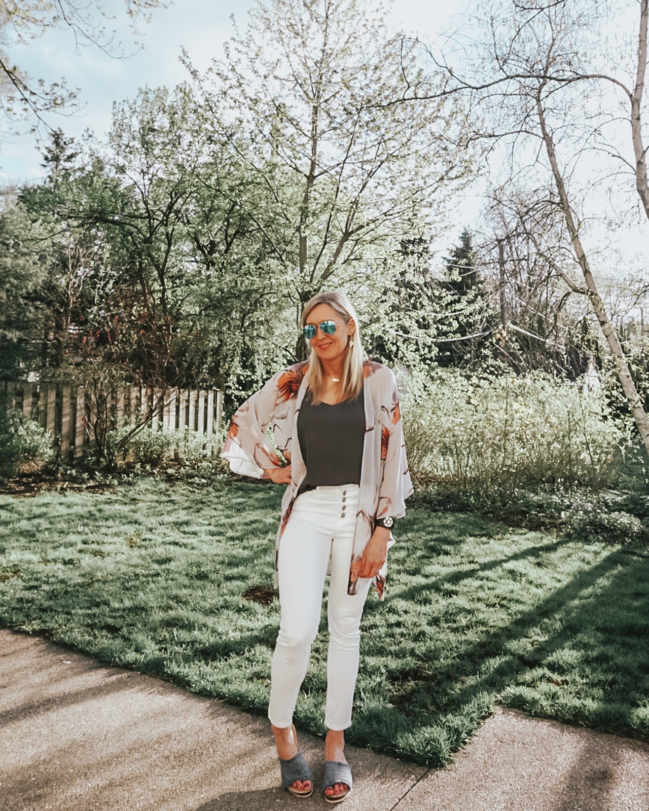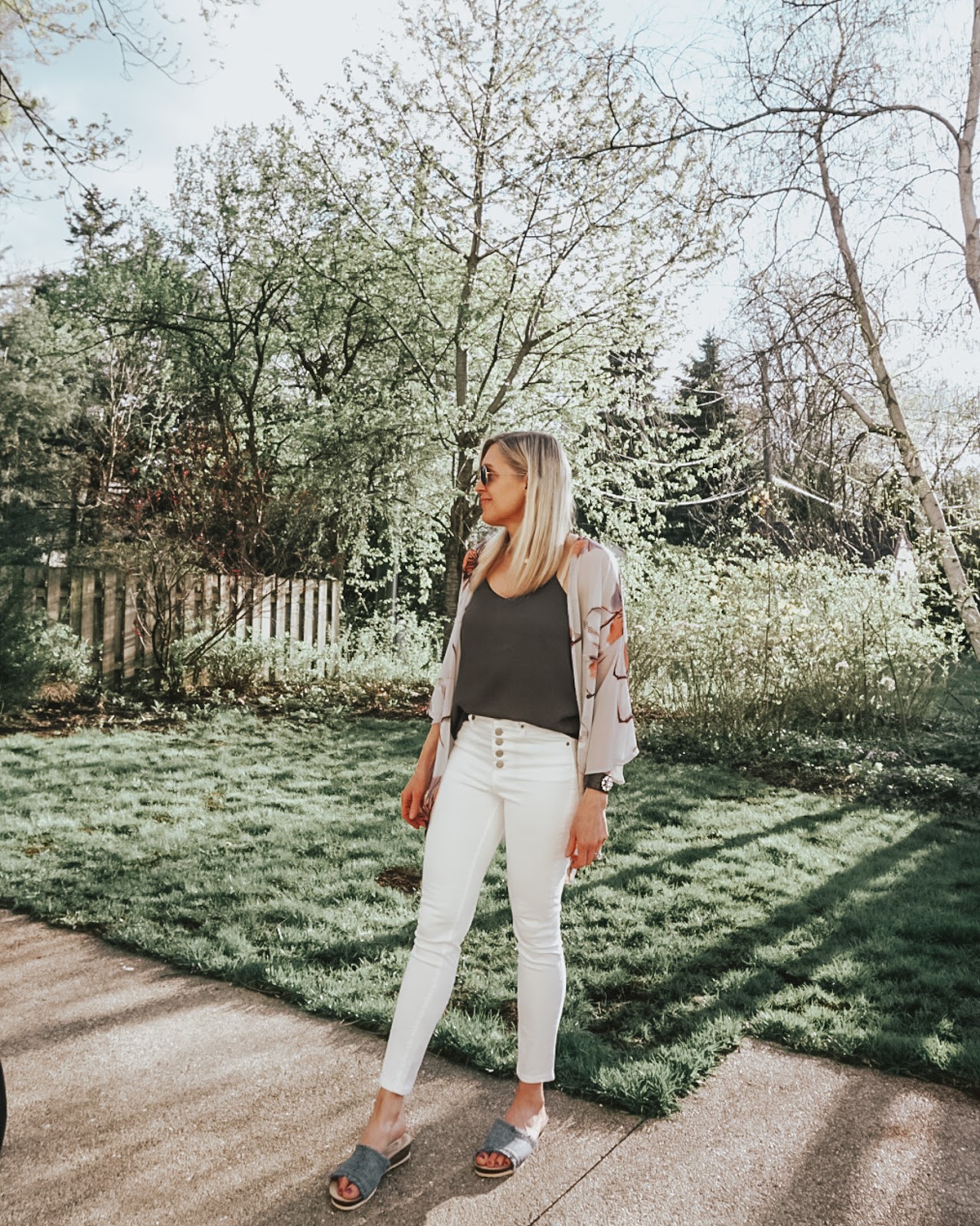 Chambray and white go hand in hand for summer, so I knew right away I’d be wearing these sandals with my white denim. I needed a light layer and added a kimono (if you don’t have a kimono yet, it’s the perfect spring and summer topper). These sandals would be cute with a chambray dress for a denim on denim look or with bright shorts and a tank or tee!