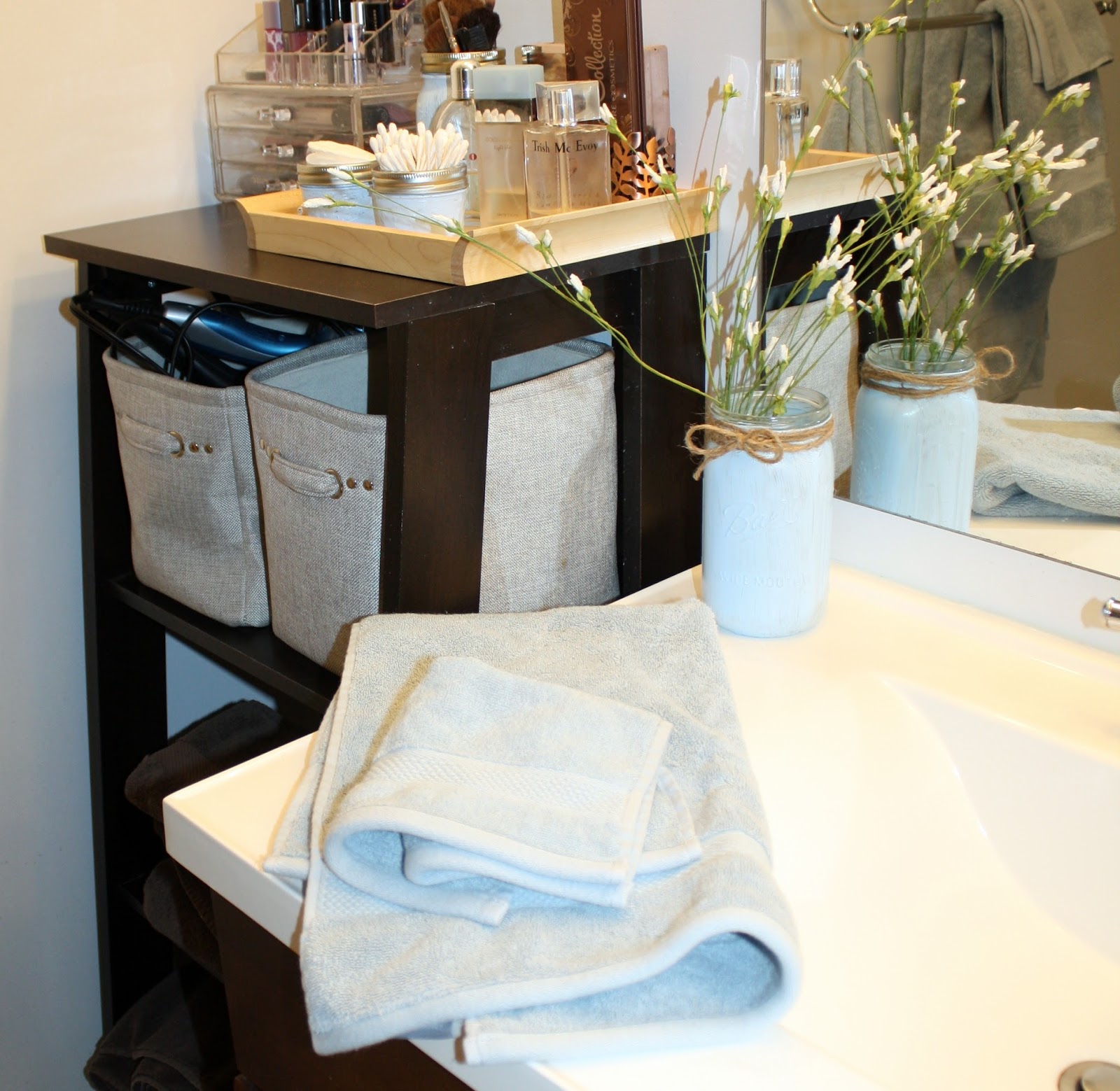 3) Use storage as part of your decor. Hide the hair dryer, flat iron, etc with decorative storage bins. I picked these up at TJ Maxx for $5.99 each. The clutter is gone but the contents are still easily accessible.