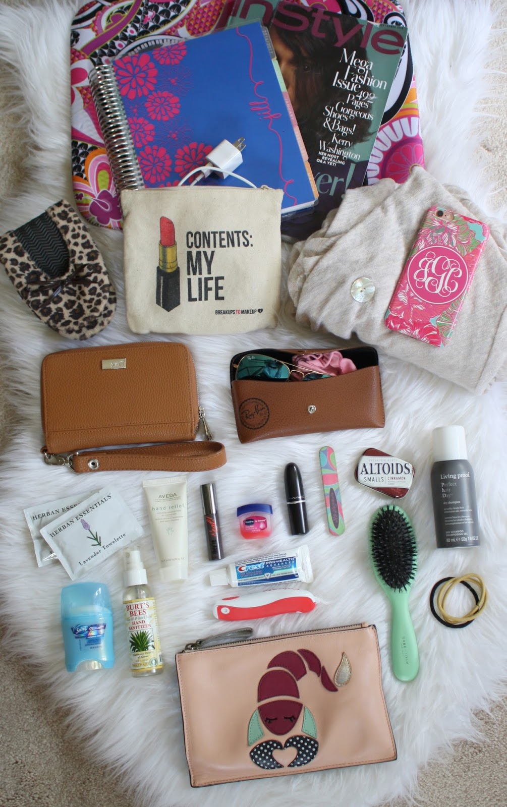 I use a small makeup bag for my emergency kit, it’s full of a few fix-me-up items. A hairbrush, hair ties, and dry shampoo. Lip balm, lipstick, mascara, and facial wipes. Mini toothbrush, toothpaste. Nail file, hand cream, hand sanitizer, mini deodorant, and facial wipes. I also carry tissues and Tylenol.